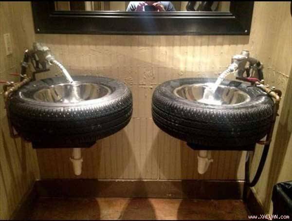 Bánh xe biến thành bồn rửa mặt và máy bơm nhiên liệu cũ trở thành vòi nước. Đây thực sự là một sáng kiến vô cùng tuyệt vời. Phòng tắm này sẽ thỏa mãn ước mơ của những cậu nhóc yêu ô tô nhà bạn.